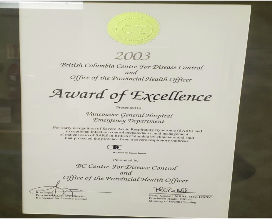 DR LYNE FILIATRAULT: months later I get this phone call, somebody saying, Hey, we have an award, uh, that we want to give you at this ceremony at the BCCDC. And I was a bit surprised about it. To me, it was, I was doing my job, I said, "there's no way I'm gonna, I'm gonna do this". And I said, "listen, first of all, make it to the emergency department because this was a team effort."DANIELLA: She didn’t go to the ceremony and went to do her shift at the emergency department instead. But if you go to the Vancouver General Hospital emergency room (hopefully without something else that needs attention) it's posted on the wall just in front of registration in the emergency department.